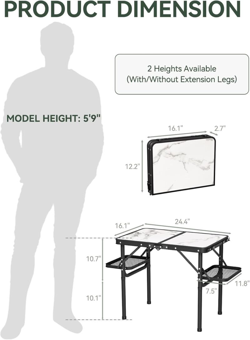 • Foldable & Portable. The open dimension of our small camping table is 24.4″L x 16.3″W x 20.9″H and the folding dimension is 12.2″L x 16.3″W x 2.7″H. Pratical and space-saving.
